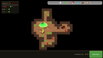 Attini is a turn based strategy game, centered around converting and gathering resources. You control a colony of attini ants that grow a massive fungi in the center of their colony. Throughout the game you will have to bring various resources to the mushroom to keep it alive and use it to smoothly run your colony. You will command your ants to gather resources, explore the underground, build various constructions to use your resources more efficiently and use the mushroom to your advantage.